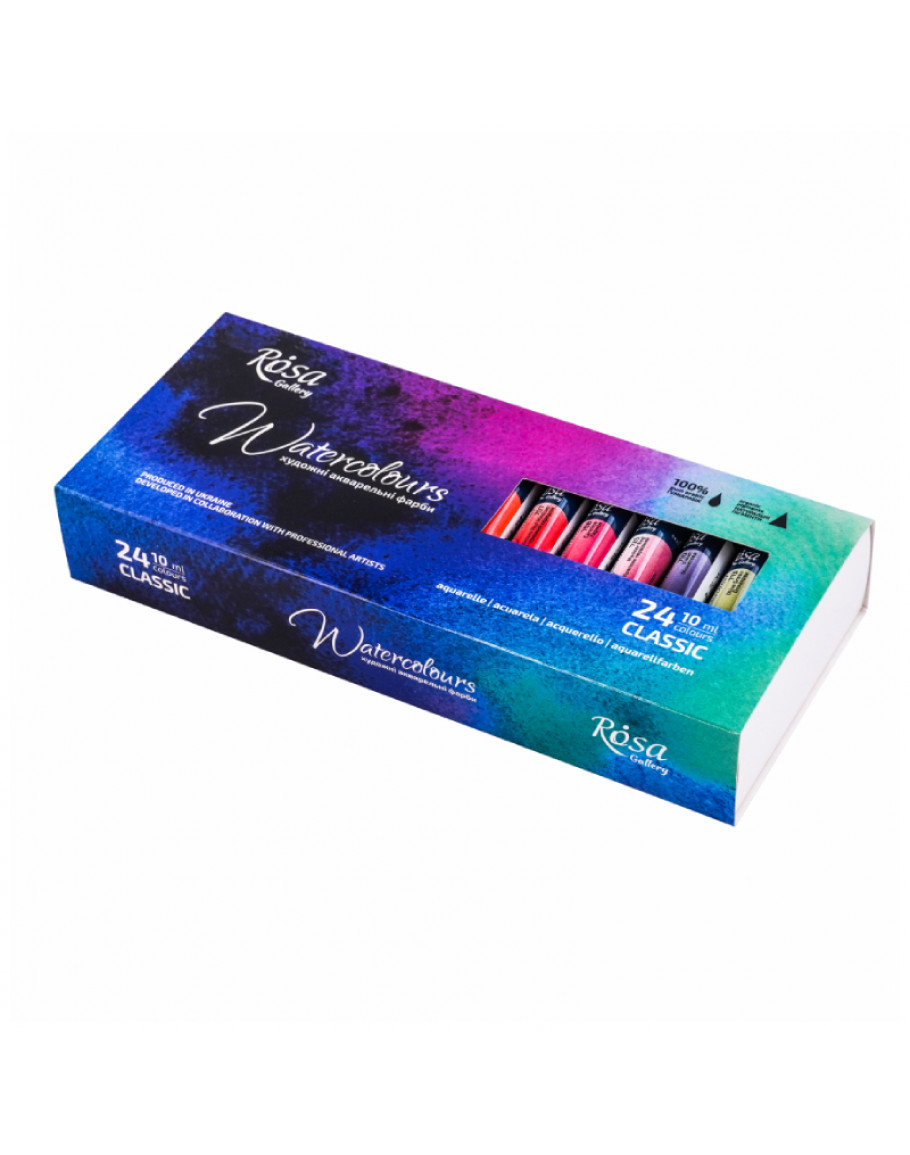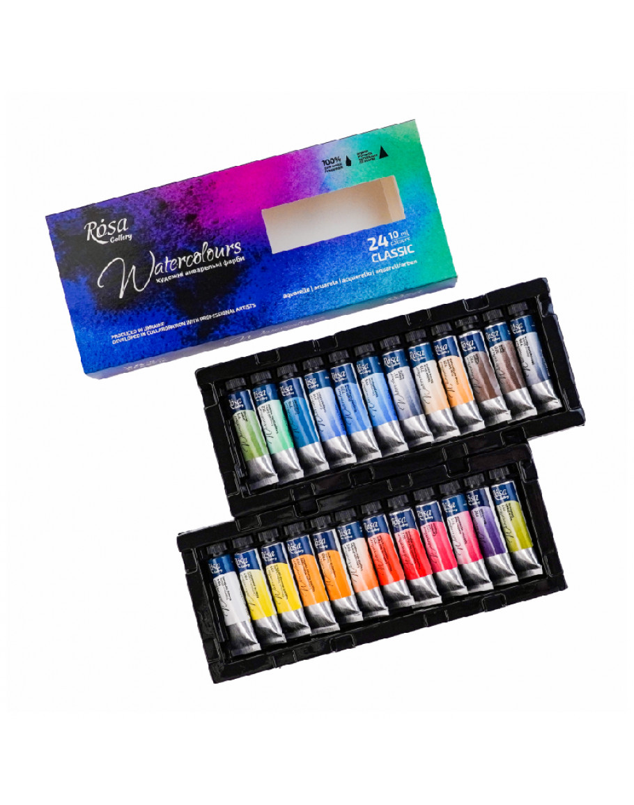 Набір акварельних фарб від українського бренду ROSA. Подарунковий набір акварельних фарб 24 кольори ROSA Gallery. Оригінальні акварельні фарби ROSA Gallery в тубах. Набір акварельних фарб для професійних художників та початківців.