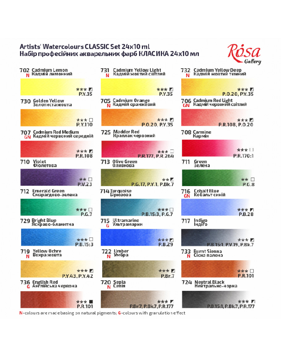 Набір акварельних фарб "Класика" складається із палітри у 24 кольори, а саме: Білила титанові, Кадмій лимонний, Кадмій жовтий світлий, Кадмій жовтий темний, Золотиста жовта, Кадмій оранжевий, Кадмій червоний світлий, Кадмій червоний середній, Кармін, Краплак червоний, Фіолетова, Оливкова, Зелена, Смарагдово-зелена, Бірюзова, Кобальт синій, Яскраво блакитна, Ультрамарин, Індиго, Вохра жовта, Умбра, Сієна натуральна, Сепія, Нейтрально-чорна.