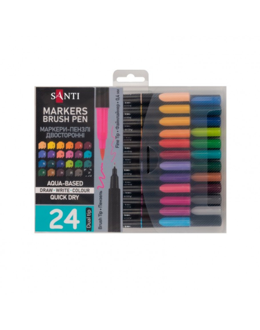 Santi набір акварельних маркерів "Brush Pen", двосторонні, 24 кольори. Маркери мають пензель 1–4 мм та лайнер 0,4 мм. Чорнила на водній основі, швидко висихають, добре змішуються. Підходять для каліграфії, ілюстрацій та скетчингу.
