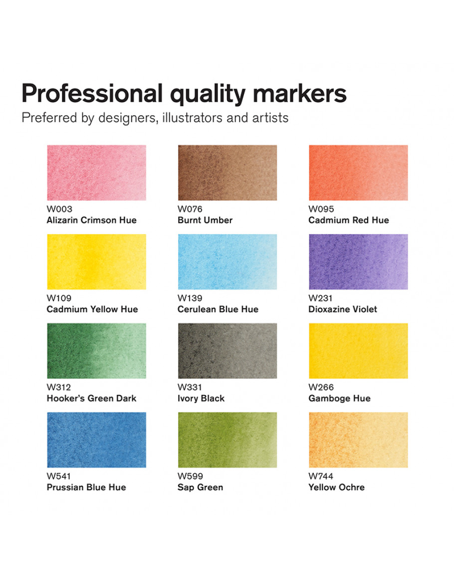 Розширений набір акварельних маркерів Winsor & Newton Promarker Watercolour містить 12 насичених базових кольорів, які дозволяють створювати складні палітри та експериментувати з акварельними ефектами. Чорнила на водній основі забезпечують високу пігментацію, світлостійкість і плавність змішування кольорів. Кожен маркер має два наконечники: пензлик для м'яких градієнтів і тонкий наконечник для деталізації. Набір включає широкий спектр базових і додаткових кольорів, які стануть у пригоді як новачкам, так і професійним художникам.