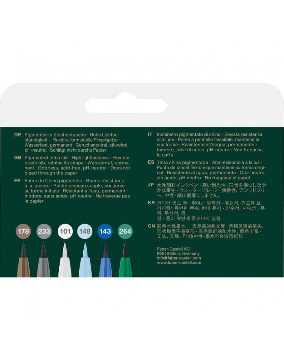 Брашпени для малювання, макетування та дизайну Faber-Castell. Набір з 6 брашпенів. Колірна гама підібрана у холодних відтінках. Світлостійке чорнило, не розмивається водою.