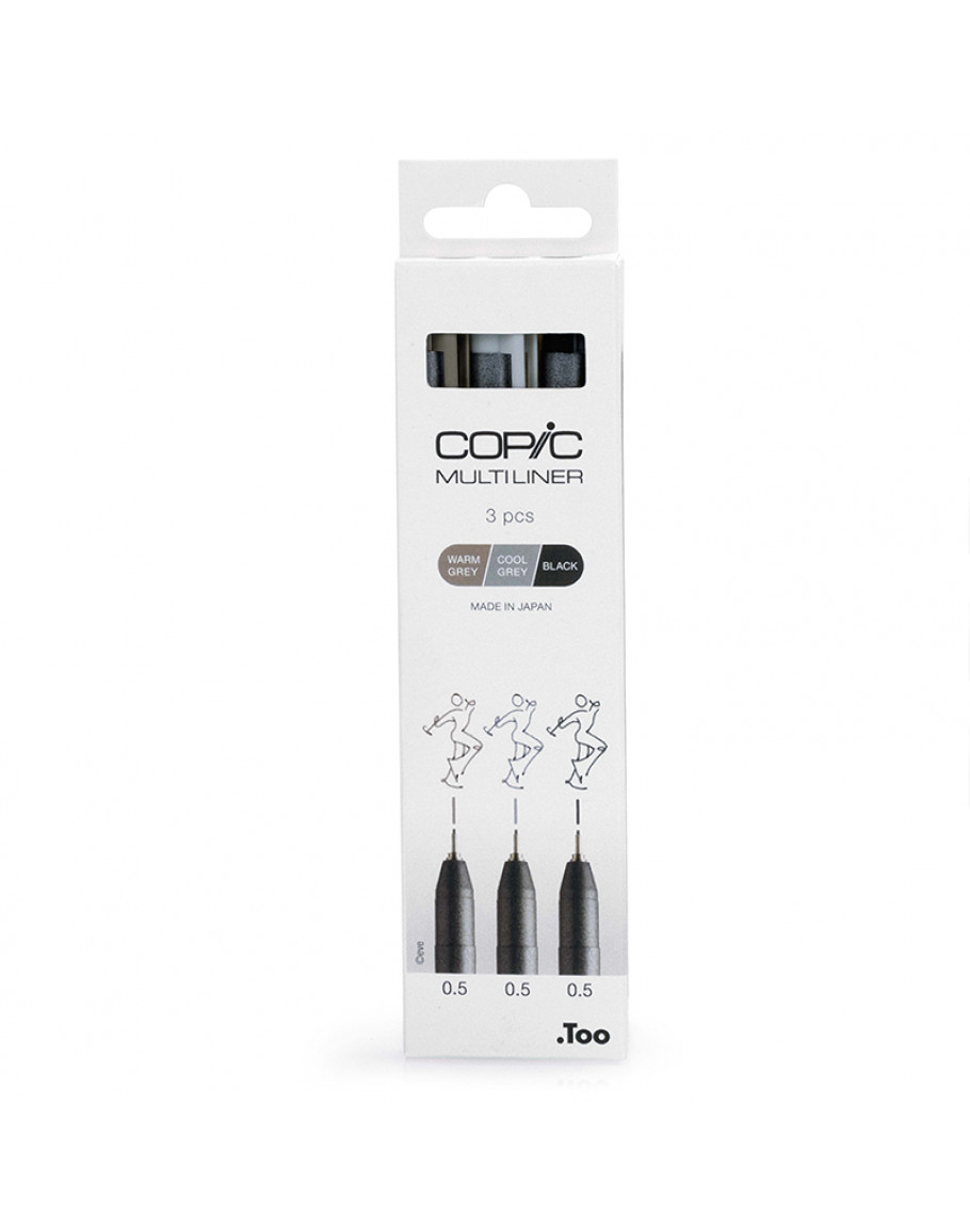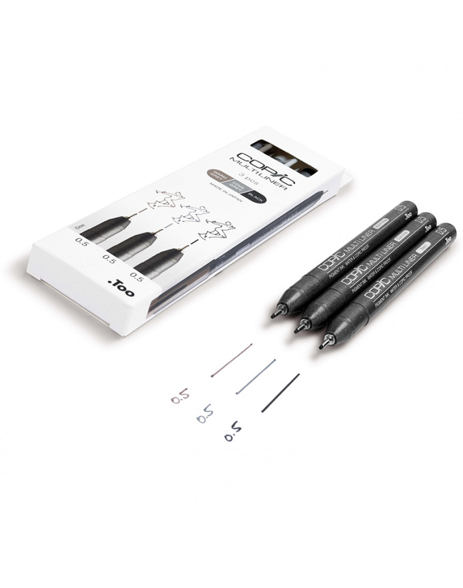 Набір Copic Multiliner (Сoloured) - це три лайнера (сірі та чорний) з водостійким та спиртостійким пігментним чорнилом. Ідеальні для скетчів і малюнків, сумісні з маркерами Copic. Забезпечують рівномірний потік чорнила та стійкість до вицвітання.