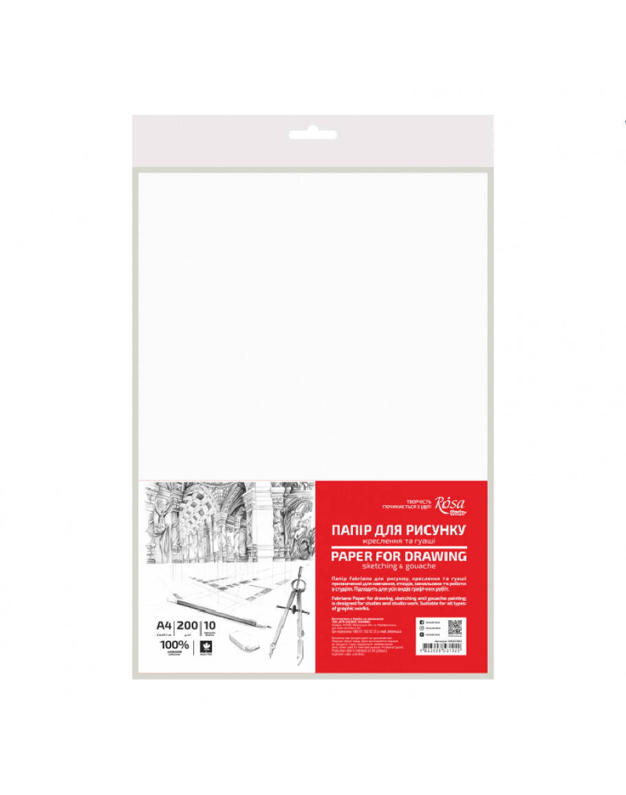 Папір для рисунку та креслення 10 аркушів А4 (21х29,7см) 200 г/м2, дрібне зерно, в плівці, ROSA Studio