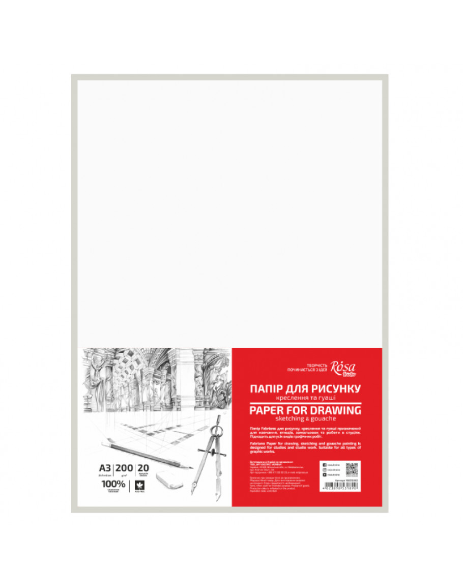 Папір для рисунку та креслення від українського виробника ROSA Studio ідеальний варінт для навчання у школі чи вузі.Він виготовлений за технологією італійського паперу Fabriano Start має дрібнозернисту текстуру та спеціальну проклейку. Папір підходить для різних технік рисунку - штрихування, розтушовування, для роботи з графітними паличками. Також можна використовувати для роботи з тушшю, лінерами, спиртовими та акриловими маркерами, гуаші и ілюстрації. Він не зминається при терті гумко та витримує до 10-ти стирань.