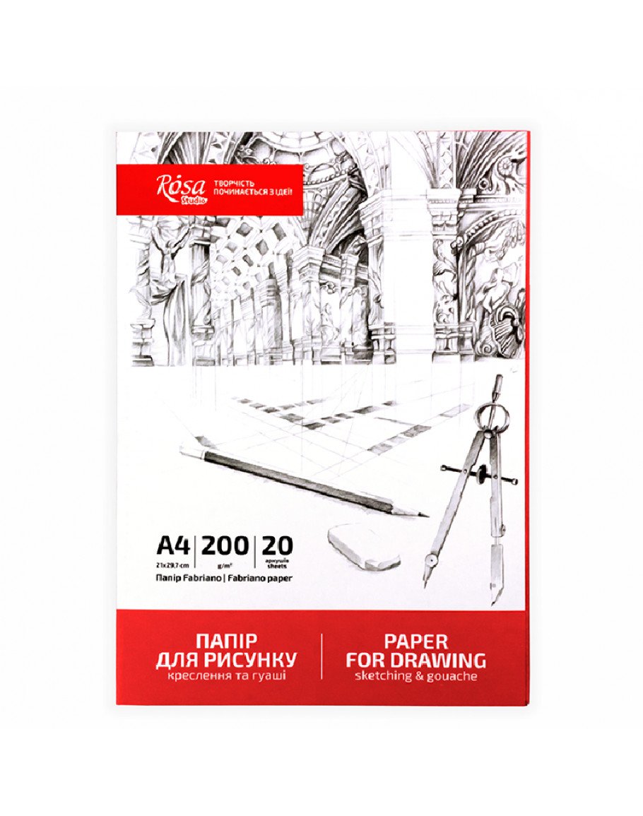 Папір для рисунку та креслення 20 аркушів А4 (21х29,7см) 200 г/м2, дрібне зерно, в папці, ROSA Studio