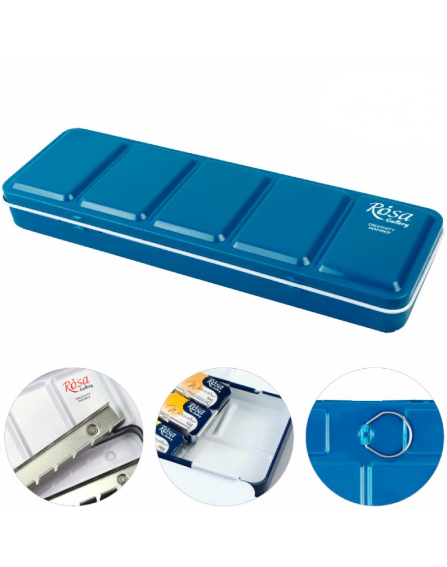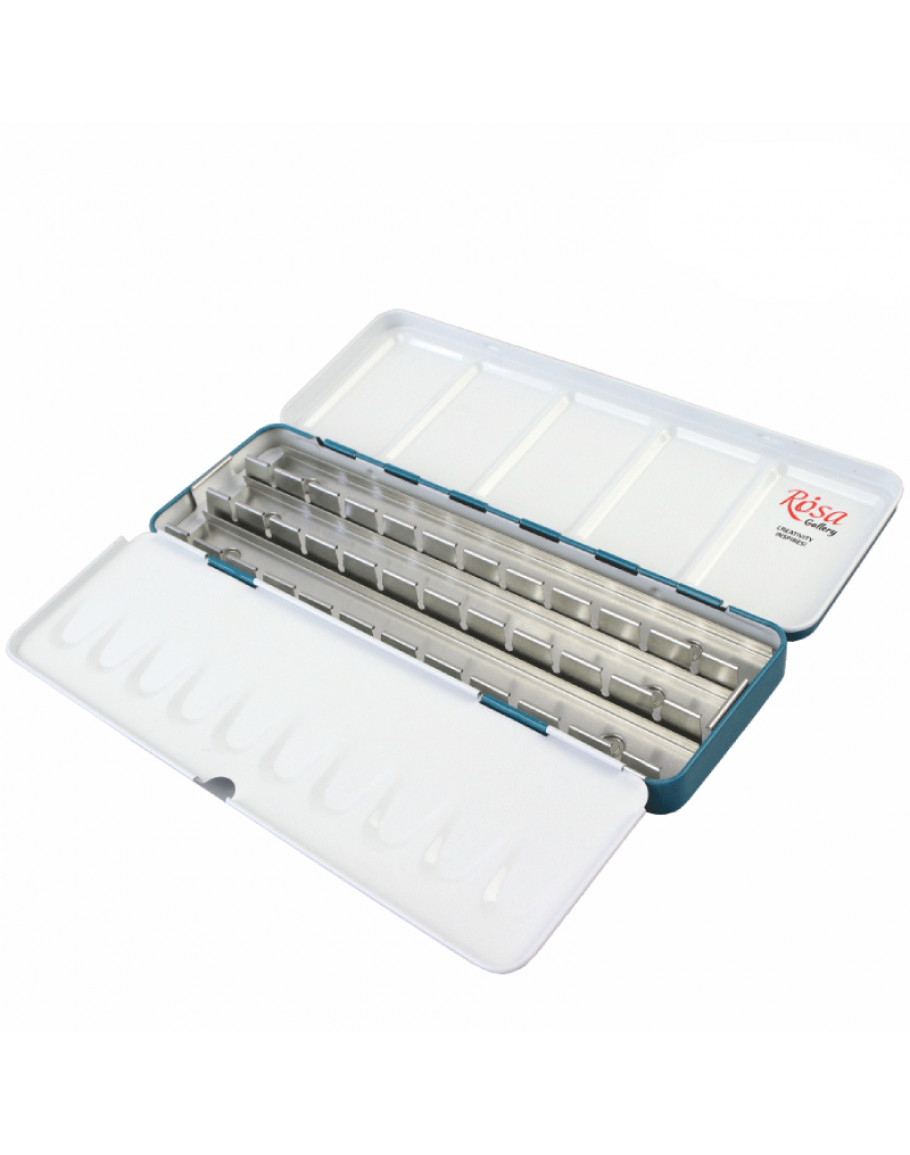 Металлический пенал для акварельных красок в кюветах от бренда ROSA Gallery представляет собой коробку с двумя встроенными палитрами разной конфигурации. Пенал имеет специальную вставку для кювет и удобный фиксатор для пальца на нижней крышке, что позволяет удобно удерживать его в руке во время работы. Ряды креплений для кювет фиксируются на специальные защелки. Такой способ крепления делает их соединение с основанием прочным и надежным, устойчивым к воде. Также при необходимости их легко отсоединить и использовать освободившееся место для расположения кисти, линера или карандаша. Аксессуар удобно переносить в сумке или этюднике, брать с собой в любое нужное место. Пенал вмещает 21 кювету.