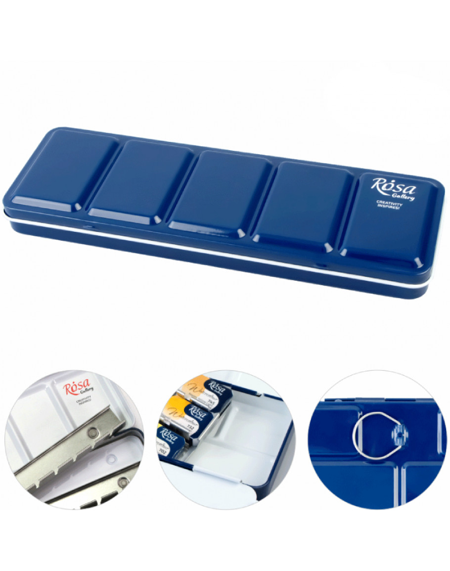 Металлический пенал для акварельных красок в кюветах от бренда ROSA Gallery представляет собой коробку с двумя встроенными палитрами разной конфигурации. Пенал имеет специальную вставку для кювет и удобный фиксатор для пальца на нижней крышке, что позволяет удобно удерживать его в руке во время работы. Ряды креплений для кювет фиксируются на специальные защелки. Такой способ крепления делает их соединение с основанием прочным и надежным, устойчивым к воде. Также при необходимости их легко отсоединить и использовать освободившееся место для расположения кисти, линера или карандаша. Аксессуар удобно переносить в сумке или этюднике, брать с собой в любое нужное место. Пенал вмещает 21 кювету.