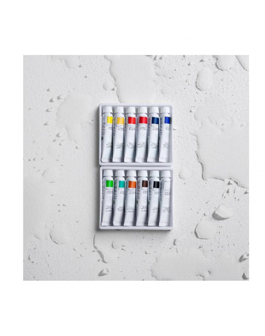 Набор акварельных красок Lefranc Studio Watercolour Set станет отличным помощником и спутником для студентов и начинающих, которые хотят познать акварельную живопись. Набор в картонной упаковке насчитывает 12 цветов акварели в тубах. Цвета хорошо пигментированы, легко смешиваются между собой и без проблем ложатся на разный тип акварельной бумаги. Высокая степень прозрачности краски позволяет создавать легкие и невесомые переходы. Упаковка в форме тубы позволяет экономно и удобно использовать акварель, смешивая ее прямо на палитре.