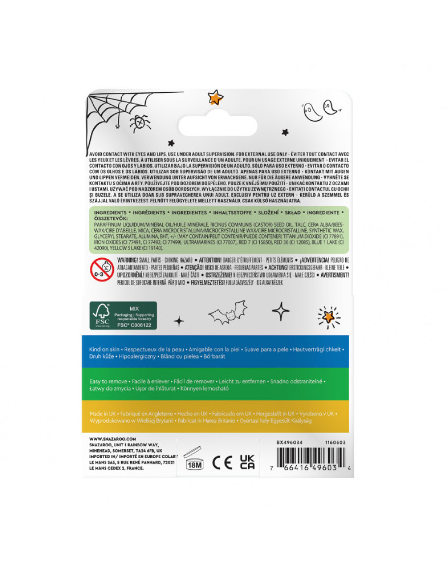 Набор карандашей для грима Snazaroo Halloween создан специально для ярких праздничных перевоплощений. В комплект входит 6 насыщенных цветов – белый, черный, красный, оранжевый, фиолетовый и зеленый. Они идеально подходят для создания образов ведьм, вампиров, монстров или любых других гелловинских персонажей. Не нуждается в воде, поэтому идеально подходит для использования в любых условиях — дома, на празднике или во время игры.